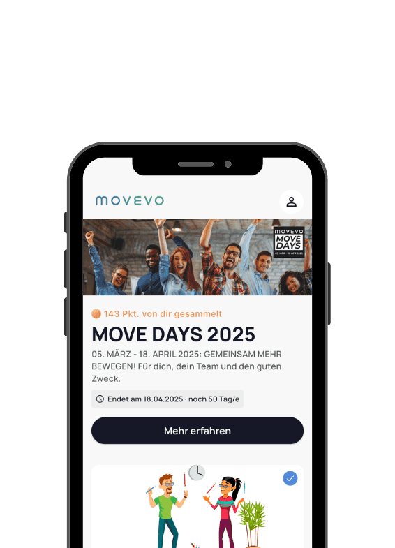 Die MOVE DAYS sind die 45-tägige Gesundheits-Challenge fürs Unternehmen – digital, DSGVO-konform und teamübergreifend. Sie steigern Bewegung, Wohlbefinden und Teamspirit und wandeln Punkte in Spenden für den guten Zweck um.
